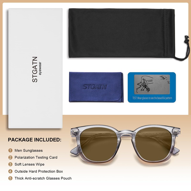 - 【PRODUCT DIMENSION】- Lens Width: 48 mm, Lens Height: 43 mm, Temple Length: 145 mm, Nose Bridge: 15 mm, Frame Inner Width: 142 mm. STGATN is a game-changer! Package included: 【1* Men Sunglasses】 【1* Soft Lenses Wipe】 【1* Polarization Testing Card】 【1* Protection Pouch】