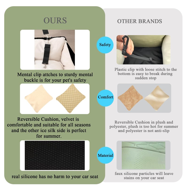 - Design and Material Upgrade: We upgrade this dog car seat both in design and material. It features a 270-degree view design for your furry friends, giving it a better view from three-sided windows while still keeping them safe. The exterior material is of this dog travel bed is upgraded from polyester to nylon, the interior material is upgraded from plush to velvet, and the summer side of the cushion is upgraded to ice silk with anti-slip design, a super cooling material for your pet. The anti-slip bottom is upgraded to real silicone particles to protect your car seat from damage. All the safety buckles are upgraded to sturdy and durable metal.