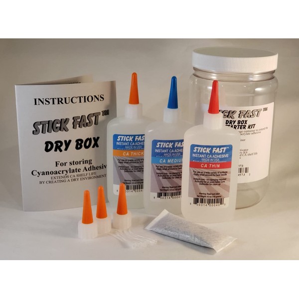 Stick Fast Cyanoacrylate (CA) Dry Box Glue Kit, 3 Bottles- Thin, Medium, Thick, (4.5 oz), Storage Container, Plus Free 3 Replacement Tips, 3 Flexible Tips, Instruction Manual