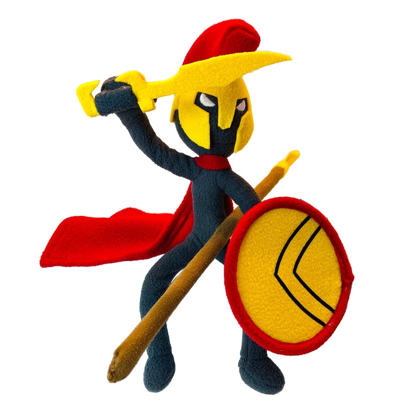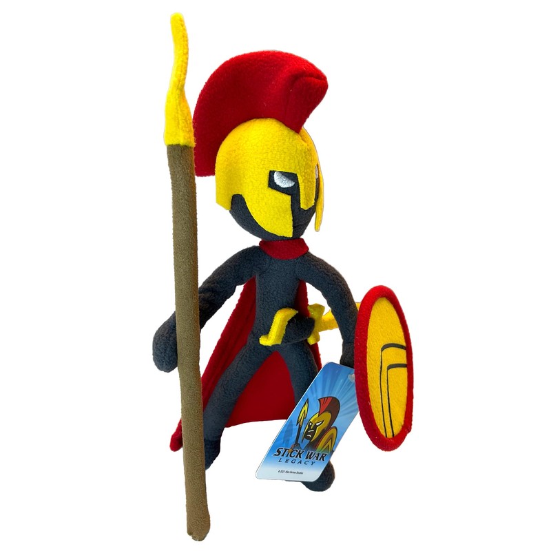 Spearton from the popular game "Stick War: Legacy". This Plush Spearton has a poseable body, arms and legs that can be moved and hold its position. The head can rotate 360 degrees independent of its body. The Spearton also contains a magnet stitched into both hands, as well as its left hip. Each Spearton comes with a magnetic spear, magnetic shield, and magnetic sword which can attach to the various magnetic points on the Spearton. Each Item comes sealed and bagged as shown.