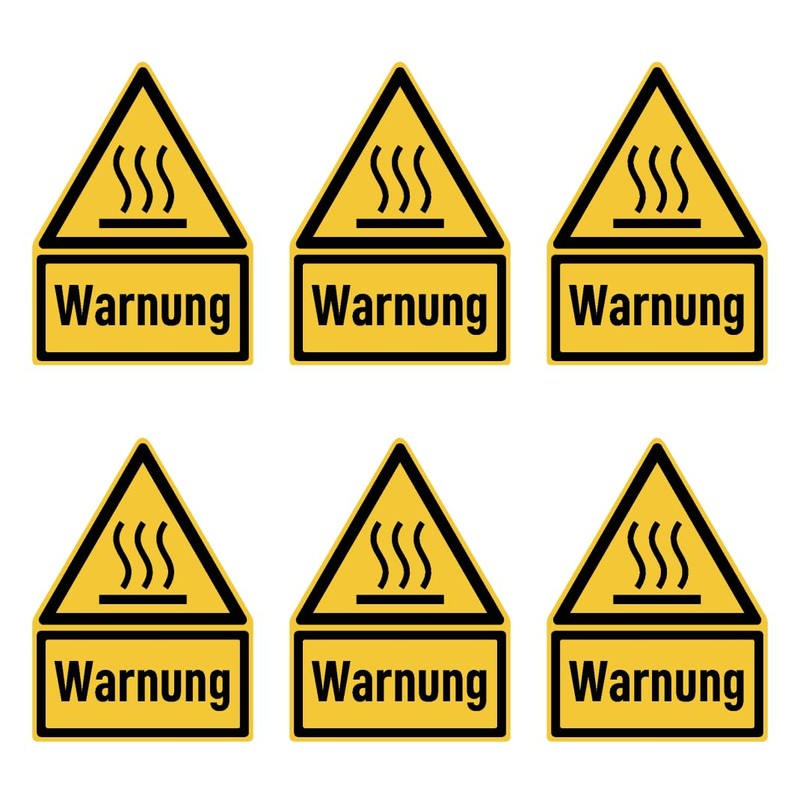 Sticker 75 x 50 mm, Pack of 6 – Signal Word Warning of Hot Surface – Warning Sign with Text (German) (Yellow/Black) – Dreick – W017 – DIN EN ISO 7010 / ASR A1.3