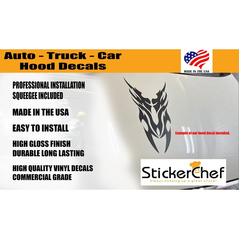 - These car and truck hood decals come in a high gloss finish. Quality durable professional grade vinyl rated up to 6 years outdoors.