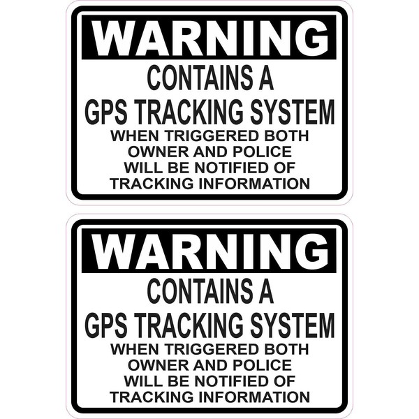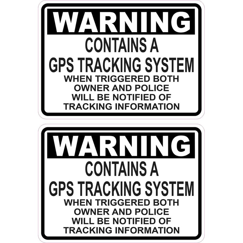 This product includes two stickers that are 3.5 inches wide by 2.5 inches tall when applied. The word, WARNING, is printed at the top of each sticker in white letters on a black rectangle. Under this, the words, CONTAINS A GPS TRACKING SYSTEM WHEN TRIGGERED BOTH OWNER AND POLICE WILL BE NOTIFIED OF TRACKING INFORMATION, is printed in black letters. The stickers' backgrounds are white. A black border is printed just inside the edges of each sticker, leaving a small, white margin on the edges of the stickers. The pink lines in the image shows where the stickers are cut; the pink lines are not printed on the stickers. This quality-made product is durable and easily visible. However, the stickers will not adhere well to textured or porous surfaces. Please note that these stickers DO NOT contain a GPS device.