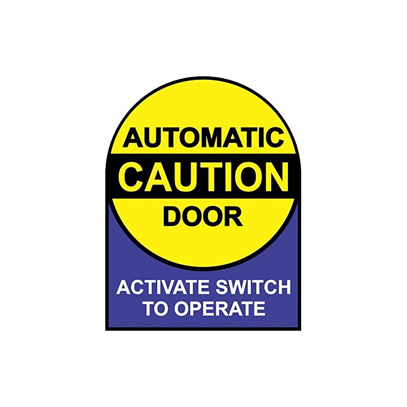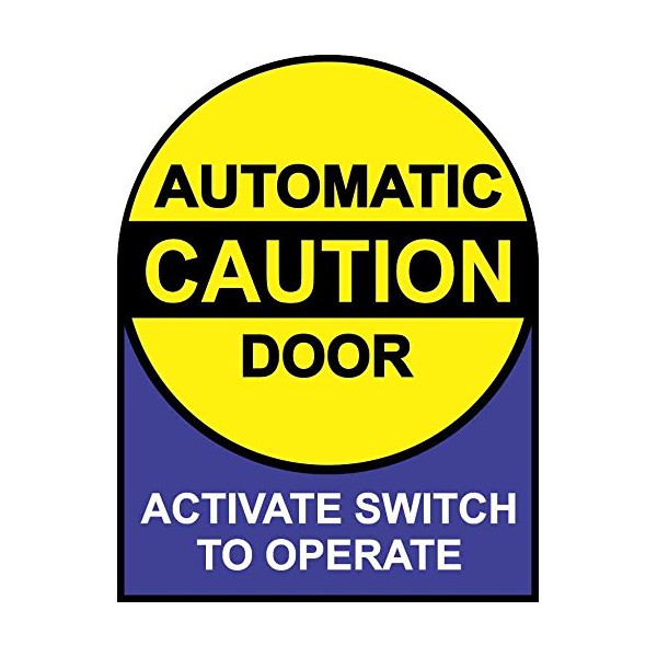 This sticker is 5 inches wide by 6.5 inches tall when applied. All sides are straight except for the rounded top. The top portion of the sticker features a yellow circle with the words, AUTOMATIC DOOR, in black letters above and below a thick, black strip with the word, CAUTION, printed in yellow. The bottom of the sticker is blue and has the phrase, ACTIVATE SWITCH TO OPERATE, in white letters. Both the circle and the outside edges are bordered in black. This quality-made product is durable and easily visible, making it ideal for use in nearly any setting!