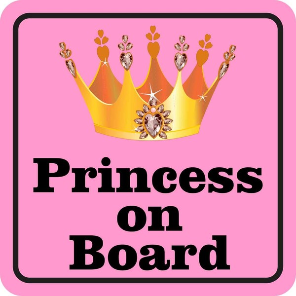 This magnet is 4 inches wide by 4 inches tall when applied. It features the words, PRINCESS ON BOARD, in black letters on a pink background. A picture of a glittering crown is printed above the text, and a black border accents the magnet's edges. This carefully crafted product is durable and easily visible, making it an adorable way to announce your princess's presence in the vehicle! However, it only attracts ferromagnetic metals.