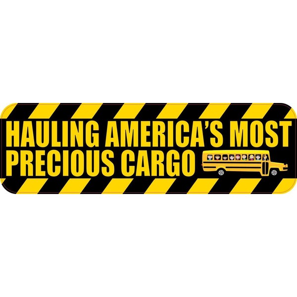 This bumper sticker is 10 inches wide by 3 inches tall when applied. It features the words, HAULING AMERICA'S MOST PRECIOUS CARGO, in yellow letters on a black background. A picture of a school bus is printed on the right side of the sticker. The top and bottom borders of the sticker are accented by yellow, diagonal stripes. This carefully crafted product is a unique way to share your passion for your occupation!