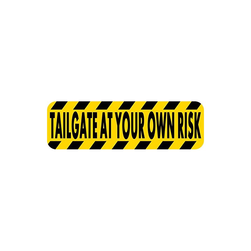 This bumper magnet is 10 inches wide by 3 inches tall when applied and has the words, TAILGATE AT YOUR OWN RISK, in black letters on a yellow background. The top and the bottom of the magnet are bordered in yellow and black diagonal stripes, giving the magnet the appearance of a caution sign.