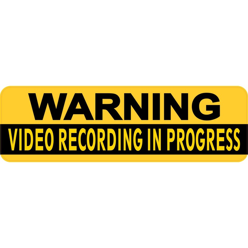 This sticker is 10 inches wide by 3 inches tall when applied. The word, WARNING, is printed near the top of the sticker in black letters on the sticker's yellow background. Below, the words, VIDEO RECORDING IN PROGRESS, are printed in yellow letters on a black rectangle. This carefully crafted product is durable and easily visible, making it ideal for display in a variety of settings and scenarios!