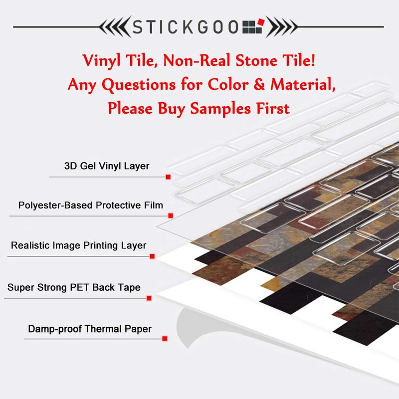 - ❁Stronger Upgrade Adhesive: 3X Stronger backing glue than ordinary vinyl backsplash tile, not only stick firmly to the smooth & clean surface, but also available on lightly textured wall