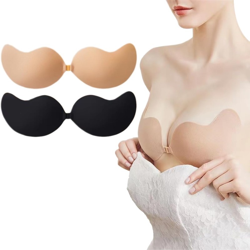 Sticky Bra, Backless Strapless Bra Push Up, Adhesive Invisible Lift Up Bras 2 Pairs,Skin&Black Color