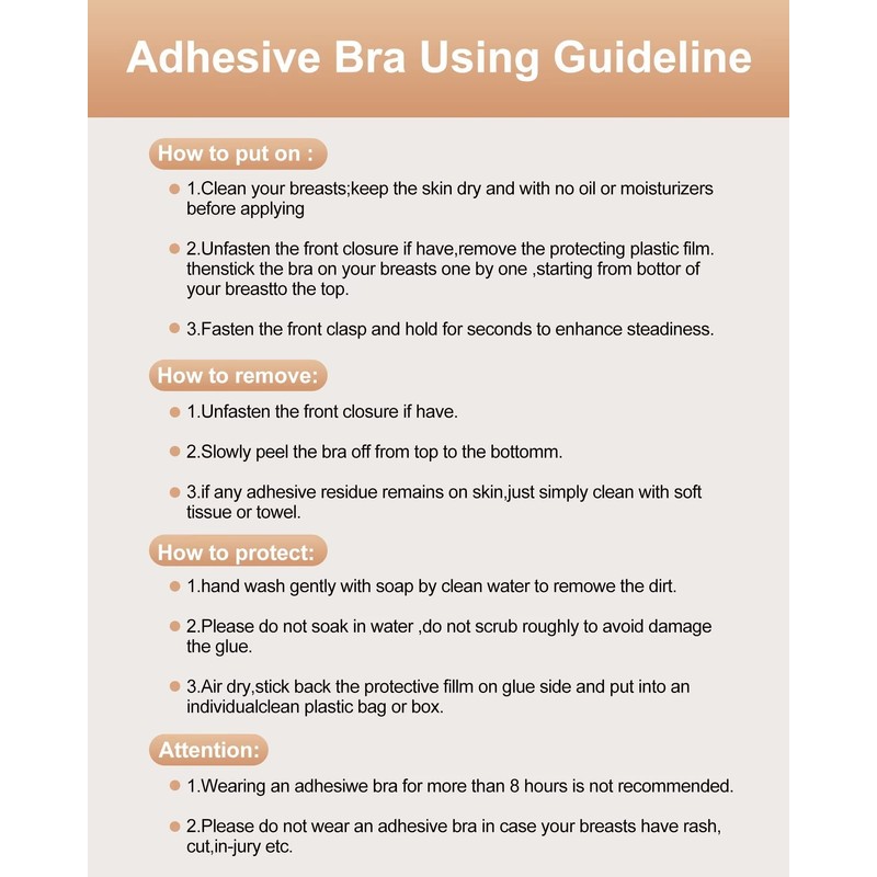 - Washable and Reusable Invisible Bra :After each use braless bra , wash it by hand with mild soap and running water, and mild soap then air dry;After drying, the plastic sheets can be reattached on and put them in a drawer for next use;Adopt premium silicone makes the no show bra can be worn multi times without loss of stickiness