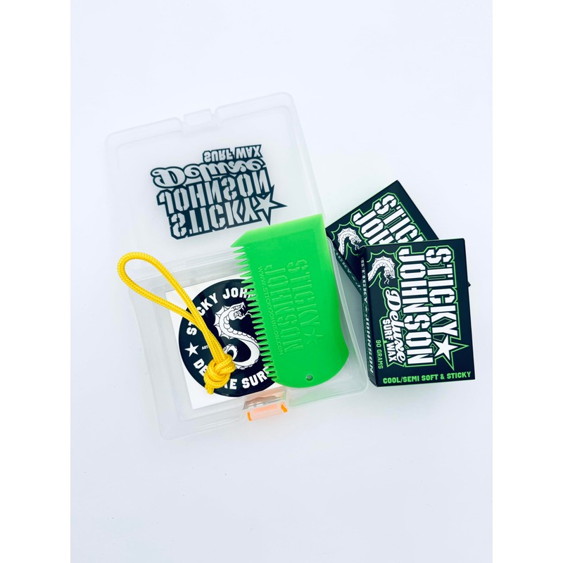 - Complete Surf Kit: Includes two blocks of Sticky Johnson Cool Water Surf Wax, wax comb, leash string, and sticker.