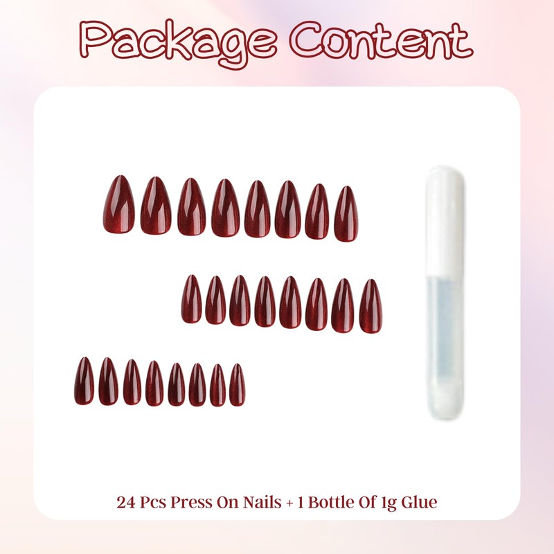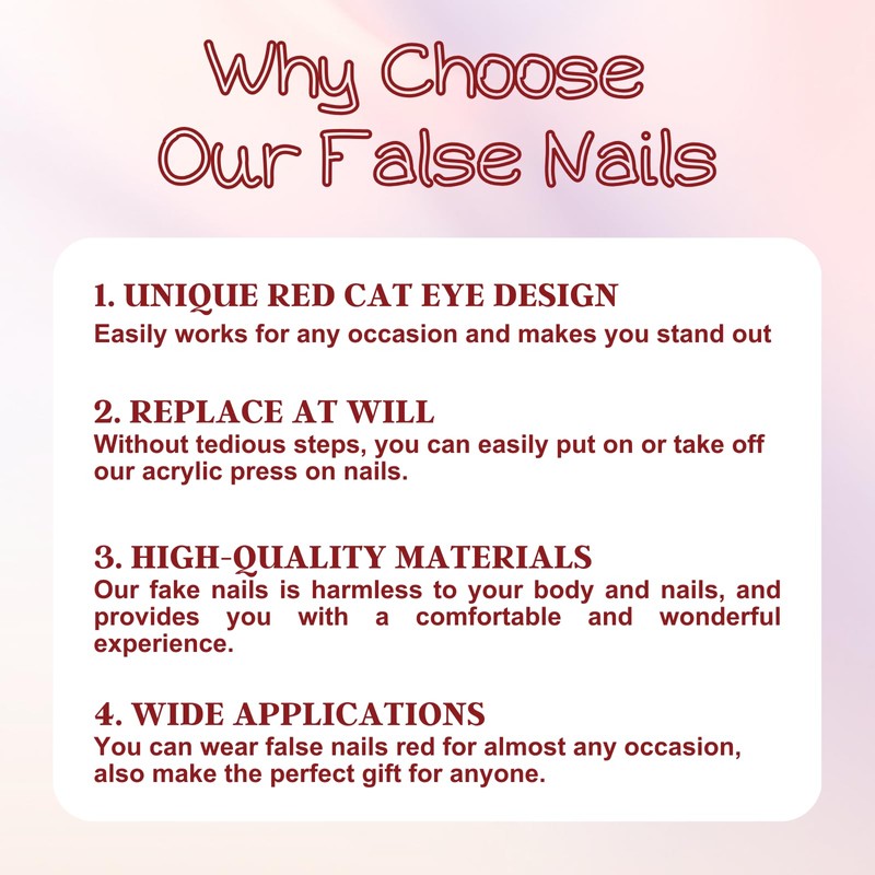 - 【Red Cat Eye Nails】You can get 24PCS cat eye press on nails and 1 tube of nail glue. This dark red nails has a unique red cat eye design that easily works for any occasion and makes you stand out