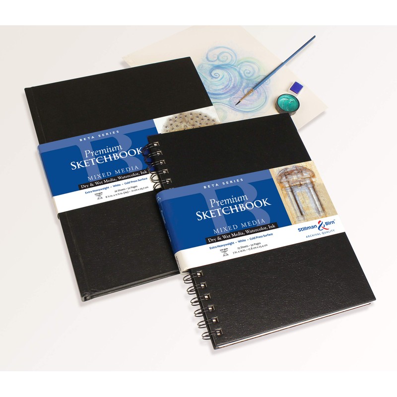 BETA SERIES – HARDBOUND SKETCHBOOKS Stillman & Birn Beta Series Hardbound Sketchbooks, 270 gsm (Extra Heavyweight), white paper, cold press surface. Suitable for dry and wet media, watercolor and ink. Example of recommended usage: working in heavier washes or overlaying washes (glazing) of watercolor or gouache. Acid-free, chloride-free, lignin-free.