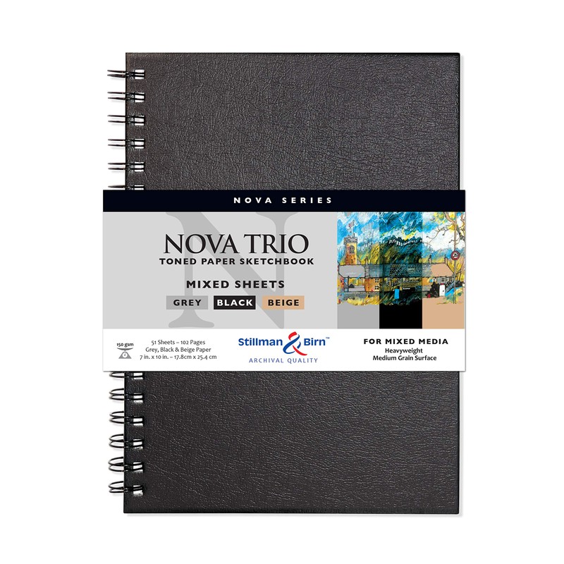 NOVA – WIREBOUND SKETCHBOOKS Stillman & Birn Nova Series Toned Paper Wirebound Sketchbooks, 150 gsm (Heavyweight), medium grain surface. Three shades: beige, grey and black. Suitable for dry media, light wash and ink. Example of recommended usage: ink underdrawing followed by layers of gouache. Acid-free, chloride-free, lignin-free.