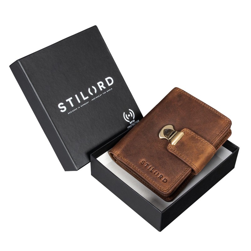 - Details: Dimensions: approx. 9.5 cm x 3.5 cm x 12 cm | Weight: 140 g | Model: 'Reese' | Material: Genuine Cowhide Leather | Brand: STILORD | Compatibility: Cards, Banknotes, Coins | Special Features: Elegant Snap Closure, RFID and NFC Protection, Gift Box