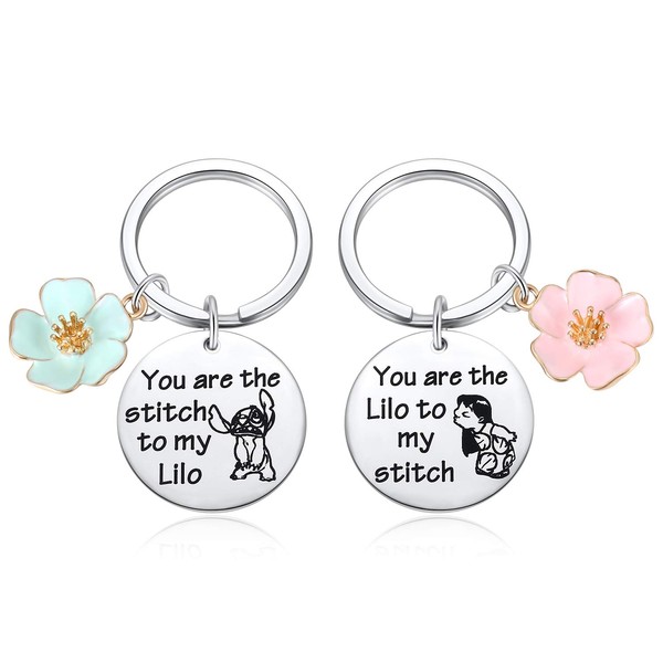 - Lilo and Stitch Keychains 2 Pieces for Best Friend - 2PCS Lilo keychain and Stitch keychain are decorated with a pink hibiscus flower and a blue hibiscus flower, respectively. Lilo and Stitch Key chains Not only are the words of friendship quote engraved, but also the cartoon characters Lilo and Stitch are printed. What a stitch stuff, perfect gift for best friend, bff, bestie, daughter or other big stitch fan gifts.