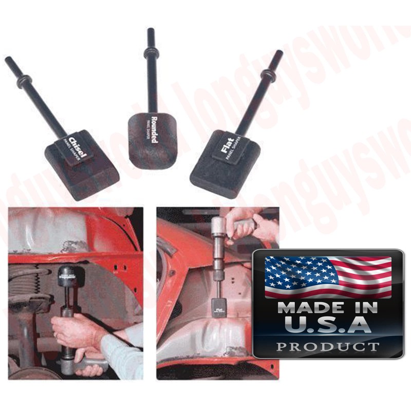 The Panel Shaper is an air hammer driven set of three self lubricating Nylon reinforced heads that allow the technician to easily access deep reach areas and badly deformed sheet metal surfaces to form them back to original shapes. Each kit contains three unique Nylon head shapes with arbors that allow each tool to be attached to your air hammer to fix body lines, concaved areas and flat surfaces.
