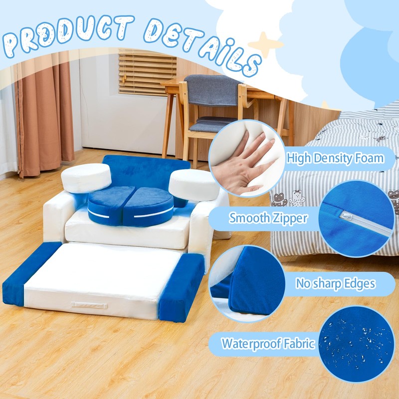 - âăMODULAR KIDS COUCHă- Compared to some bulky sofas, modular kids couch can flexibly move from bedroom to living room, from living room to playroom, from home to office, from indoor to outdoor. Also, this kids play couch can be stacked easily for convenient storage under the bed, in a corner or in a closet after each play.