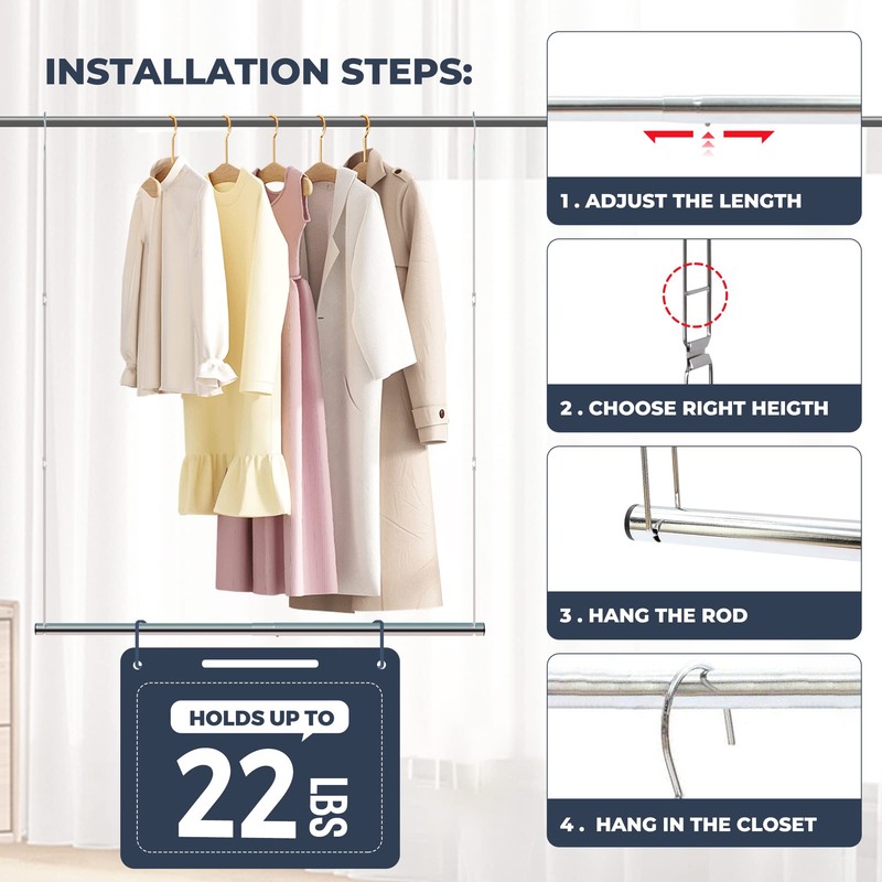 - PREMIUM MATERIAL: Hanging rods for clothes are made of heavy duty chrome steel, sturdy, rustproof and will not bend, holds up to 22lbs. Hanging rods with smooth surface will not scratch your clothes