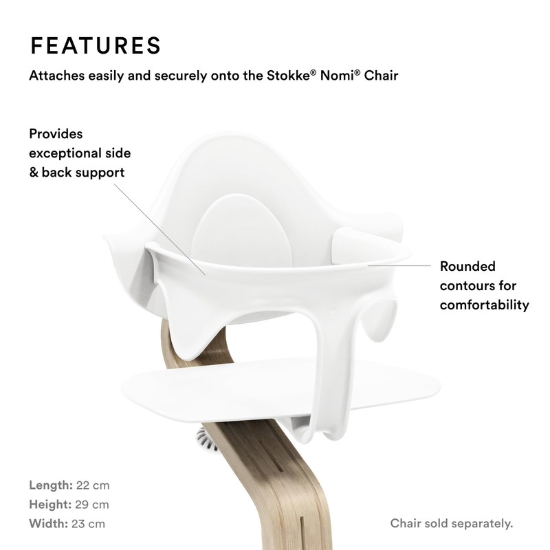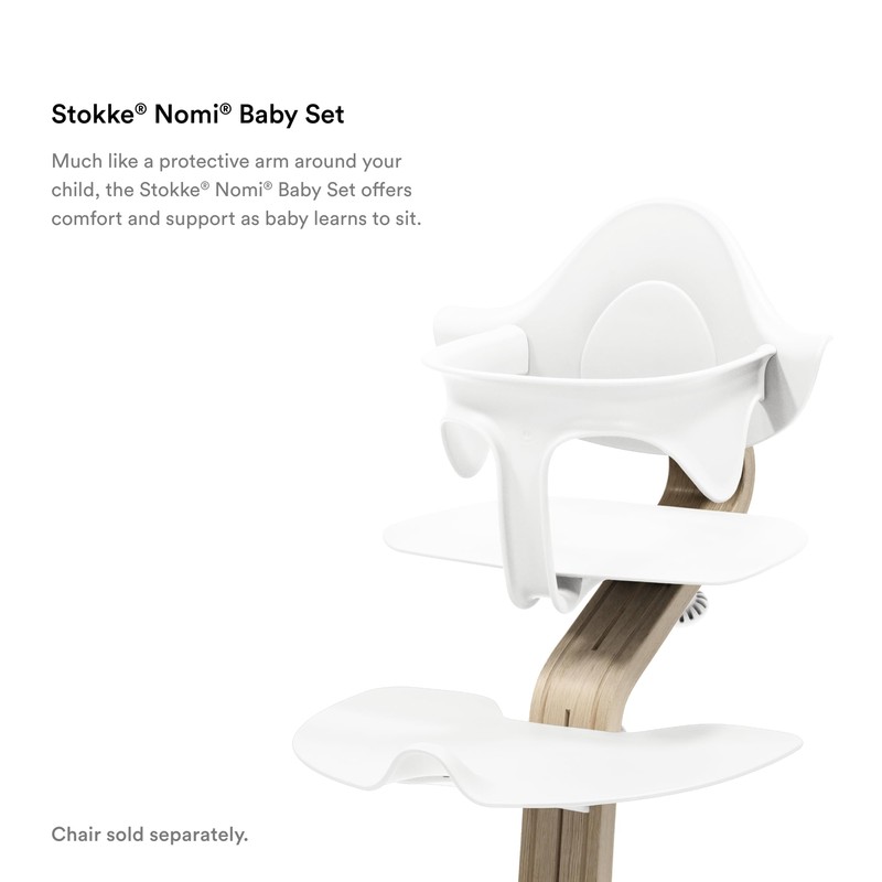 - A PROTECTIVE ARM AROUND BABY - The Stokke Nomi Baby Set easily attaches to the Nomi Chair to provide exceptional side and back support for your baby while they're learning to sit.