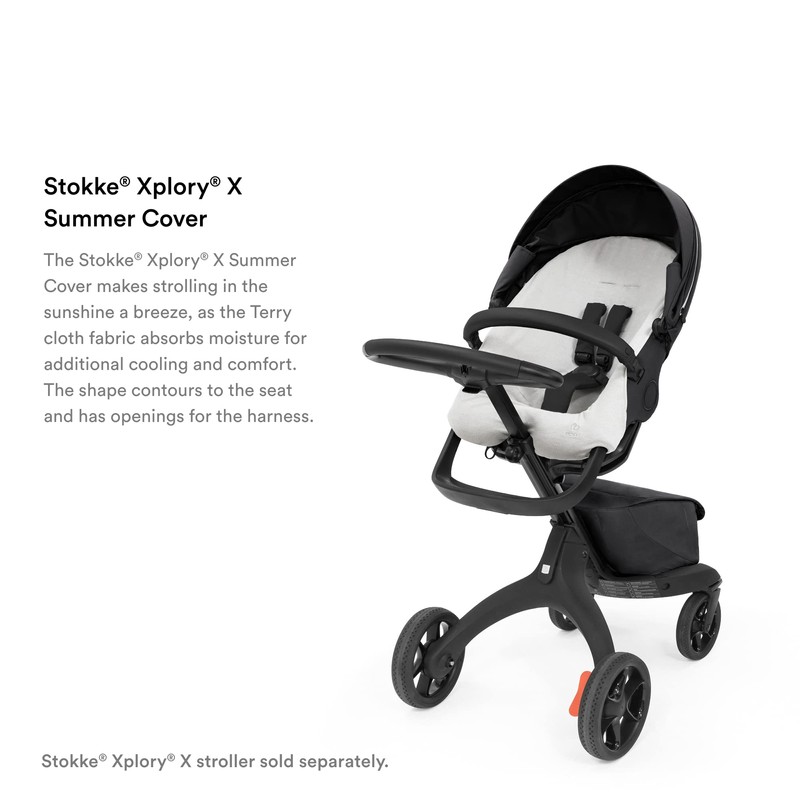 - KEEP BABY COOL - The Stokke Xplory X Summer Cover makes strolling in the sunshine a breeze, as the terry cloth fabrics absorb moisture and provide ventilation for additional cooling & comfort.