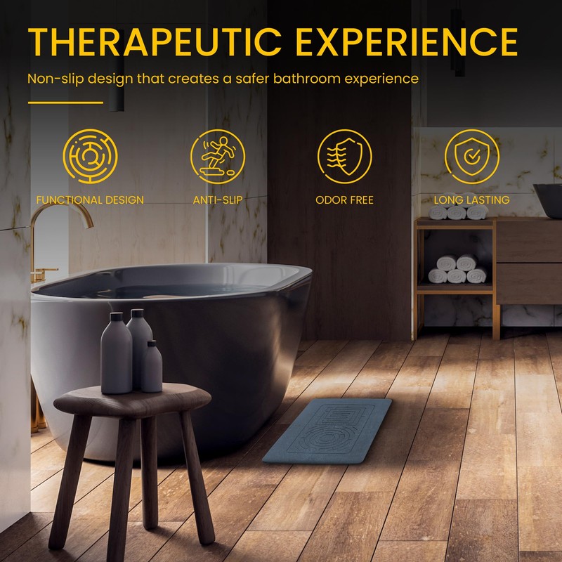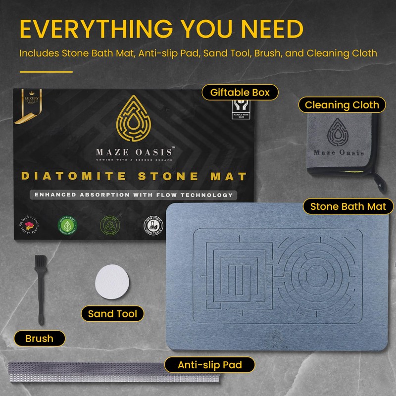 Step Out of the Shower Onto Luxury: Introducing the Revolutionary bath mat stone. Imagine stepping out of a relaxing shower and sinking your feet into a luxuriously dry surface. No more damp towels or puddles threatening a slip. Our innovative water absorbing and non slip bath mat crafted from diatomaceous earth, redefines bathroom safety and efficiency with its groundbreaking drying technology. The Secret Lies in the Maze: Unlike bath stone mats that trap water, ours features the first ever MAZE pattern. This ingenious design significantly increases the surface area, allowing water to disperse rapidly and evaporate 3-5 times faster than any competitor. Say goodbye to lingering puddles and hello to a fresher, cleaner bathroom. Unmatched Absorption & Long-lasting Performance: Experience the difference of a stone drying mat for kitchen counter meticulously engineered for superior functionality. Our custom-blended composites maximize water absorption, ensuring your feet or anything it touches is dry and comfortable in seconds. This luxury bath mat is built to last, leveraging the earth's natural properties for long-term performance. Effortless Maintenance & Modern Appeal: Maintaining your bathroom stone mat quick dry is a breeze. Simply rinse with water and allow to dry completely. For a deeper clean, use the included sanding block to rejuvenate the surface and restore peak absorbency. Available in a large size, this bath stone mats for bathroom adds a touch of sophistication to any décor. More Than Just a shower stone Mat, It's an Experience: Our Stone Bath Mat is an innovation in bathroom safety and luxury. The maze pattern is our unique value add for you, and it will transform the way you experience your bathroom. Simple, yet functional. Say hola to your alfombra de piedra para baño and oi to your tapete de piedra para baño (both terms for stone bath mat). We hope you love our global sensation!