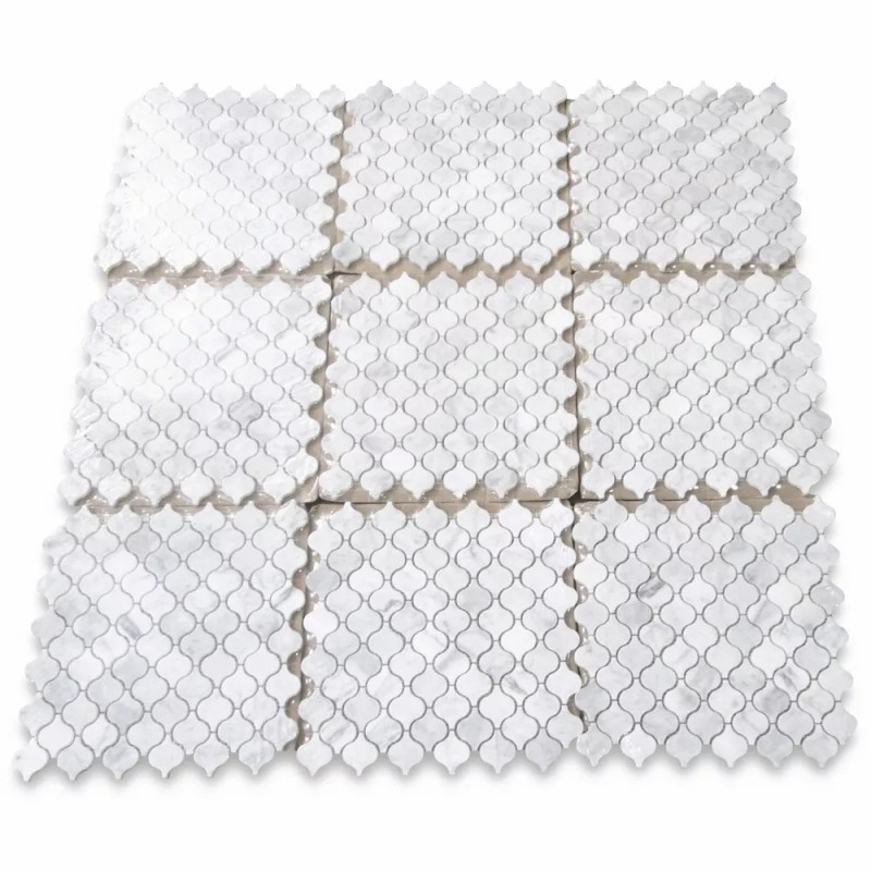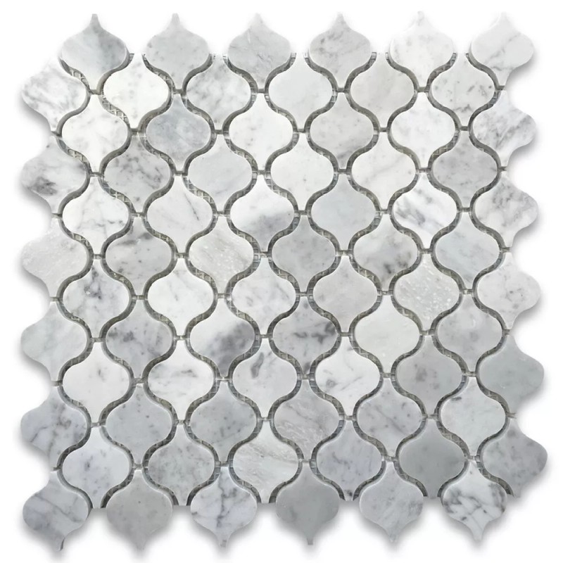 Premium Grade Lantern Shape Arabesque Baroque White Carrara Marble Mosaic Tile. Italian Bianco Carrera White Venato Carrara Honed Mini Lantern Shape Arabesque Baroque Mosaic Wall and Floor Tiles are perfect for any residential / commercial projects. The Carrara White Marble Lantern Shape Arabesque Baroque Mosaic Tile can be used for kitchen backsplash, bathroom flooring, shower surround, dining room, entryway, corridor, kitchen backsplash, spa, etc. Our timeless Matte White Carrera Marble Lantern Shape Arabesque Baroque Waterjet Mosaic Tile with a large selection of coordinating products is available and includes hexagon, herringbone, basketweave mosaics, 12x12, 18x18, 24x24, subway tile, moldings, borders, and more.