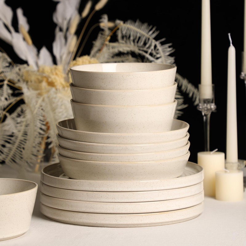 - Includes 12 pieces: 4 dinner plates (10.7”), 4 pasta bowls (8.85”), and 4 cereal bowls (7.1”)—a complete stoneware dish set for serving a group of four.