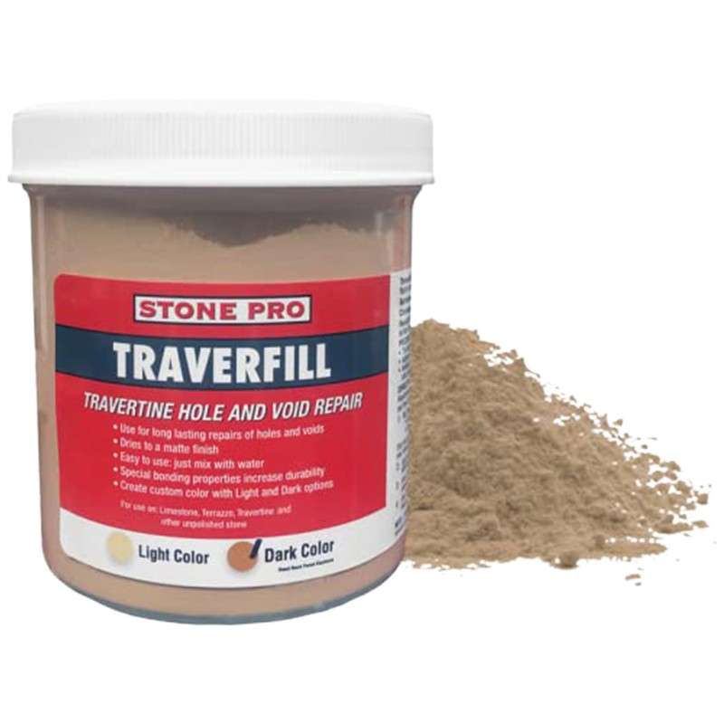 • Traverfill is an easy-to-use travertine repair product that permanently repairs unsightly holes, voids, and missing travertine fill. If unsightly holes and pits are making your travertine floor look horrible, StonePro Traverfill is your answer. Traverfill is available in either LIGHT or DARK colors to match most travertine and can be mixed to create your own custom color. Dries to a matte finish. This powder is converted to a paste by adding water and is applied like spackle.