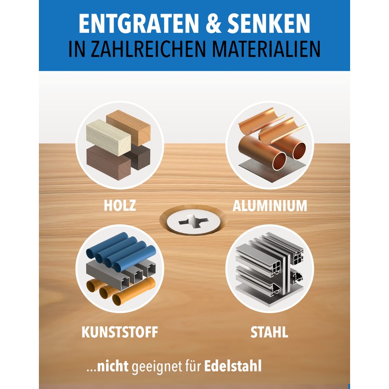 - Extremely sharp – thanks to the special and elaborate industrial cut, our countersinks are very sharp and especially the lowering into soft materials such as wood or plastic succeeds without tearing.