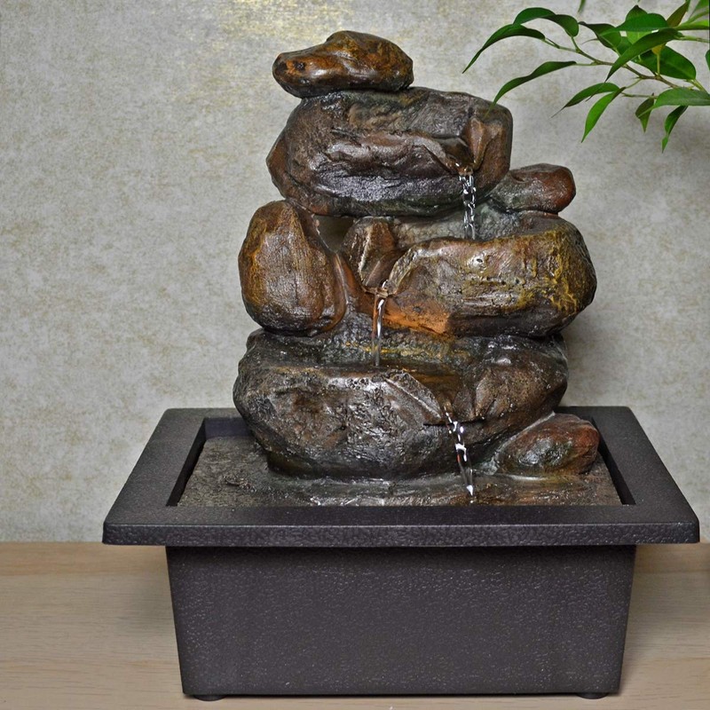 A tranquil piece of home decor - rock effect table top indoor water fountain complete with LED lights. This water fountain comes with one 3 metre power cable that powers both the water pump and the LED's. The water trickles down the stones and the pump beneath recycles the water back to the top of the rock pile. The gentle sound of flowing water creates a very peaceful environment.