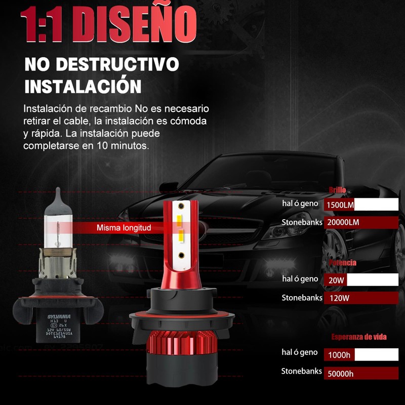 StoneBanks Kit De Faros Auto Led H13 9008,120W 20000LM Bombillas,6000K Plug & Play 400% SúPer Brillante Luz Alta Y Baja,Faros Antiniebla, 2 Unidades