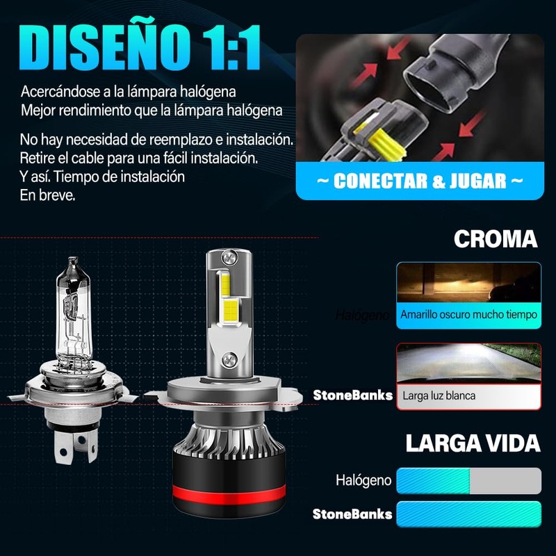 StoneBanks Kit De Faros Auto Led H4 HB2 9003,160 Vatios 30000LM Focos, 6000K Blanco Bombillas Plug & Play 600% Súper Brillante Luz Alta Y Baja,Faros Antiniebla, 2 Unidades