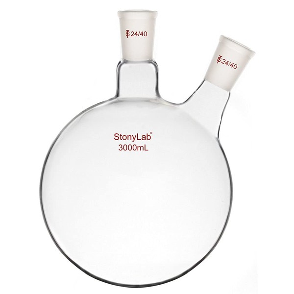 StonyLab Glass 2 Neck Round Bottom Flask RBF, with 24/40 Center and Side Standard Taper Outer Joint (3000ml)