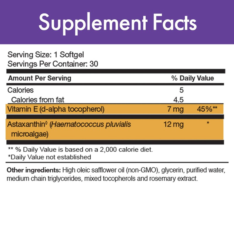 Calories - 15 | Calories from fat - 10 | Vitamin E (d-alpha-tocopherol) - 7 mg | Astaxanthin (Haematococcus pluvialis microalgae) - 12 mg [Other Ingredients: High oleic safflower oil (non-GMO), gelatin, water, glycerin and medium chain triglycerides].