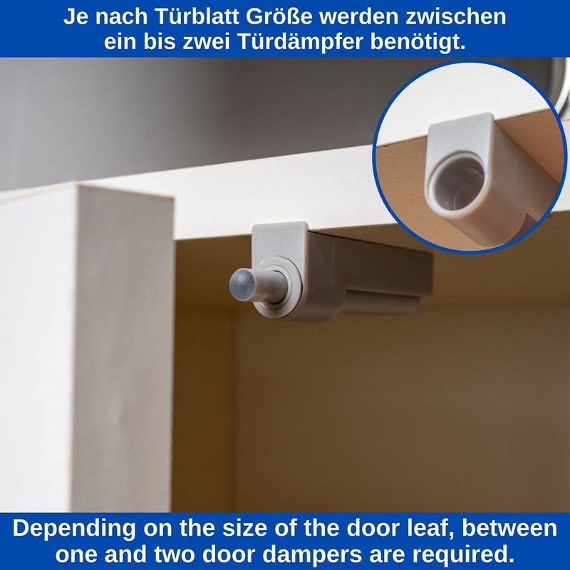 • Cost-effective upgrade compared to drawers with integrated soft-close cushioning: the door damper buffers can either be screwed to the cabinet inner wall with housing or inserted into the inlet without housing.