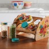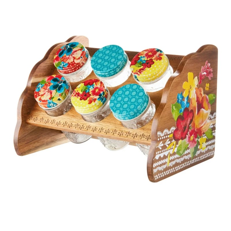 Vintage-style jars keep your favorite spices organized and within reach in this fun and functional pantry essential. Perfect for adding a quick dash of spice to your favorite dishes, the jars fit snugly in the rack and feature ceramic lids topped with colorful floral details. The sturdy base is made from rustic acacia wood with painted floral prints that match other pieces in The Pioneer Woman Collection. Place it on your counter or in your pantry and add some homespun zest to your decor. This item adds both whimsy and a pop of color to every kitchen. Made of long-lasting acacia wood, keep this item clean by simply wiping it with a damp cloth.
