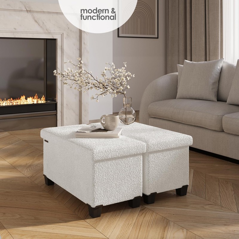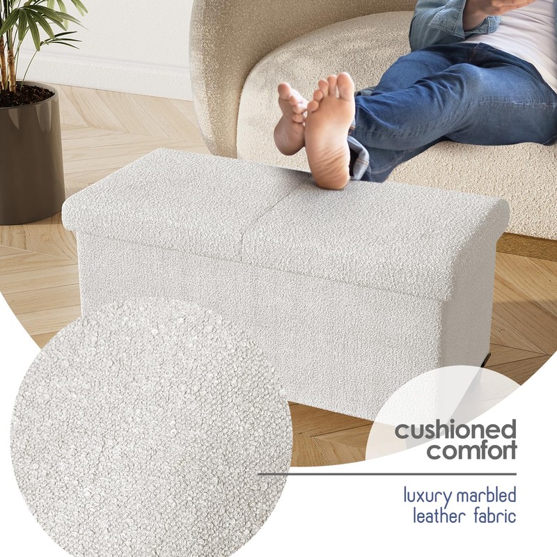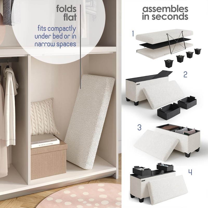 - Durable Boucle Ottoman: Organize essentials and accessories with this multipurpose storage ottoman bench that provides you with a comfortable seat for putting on socks and shoes, while making a statement as an end of bed storage bench or entry bench with storage.