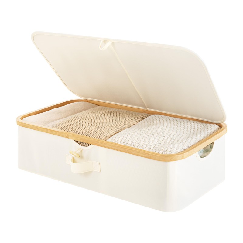 StorageWorks Underbed Storage Box with Bamboo Frame, 42L Flip-Top Under Bed Container for Blankets, Bed Sheets, Coverlets and Towels, Beige