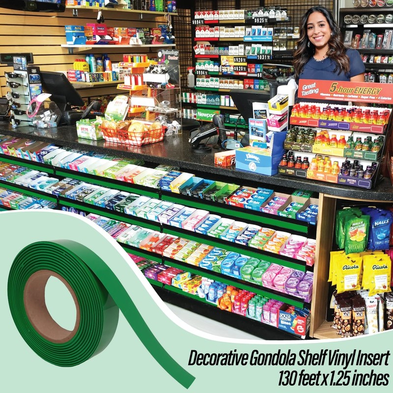 STORE FIXTURES DIRECT Decorative Gondola Shelf Vinyl Insert, Ticket Channel Accent Strip 130' x 1.25" - 5 Pack, Green