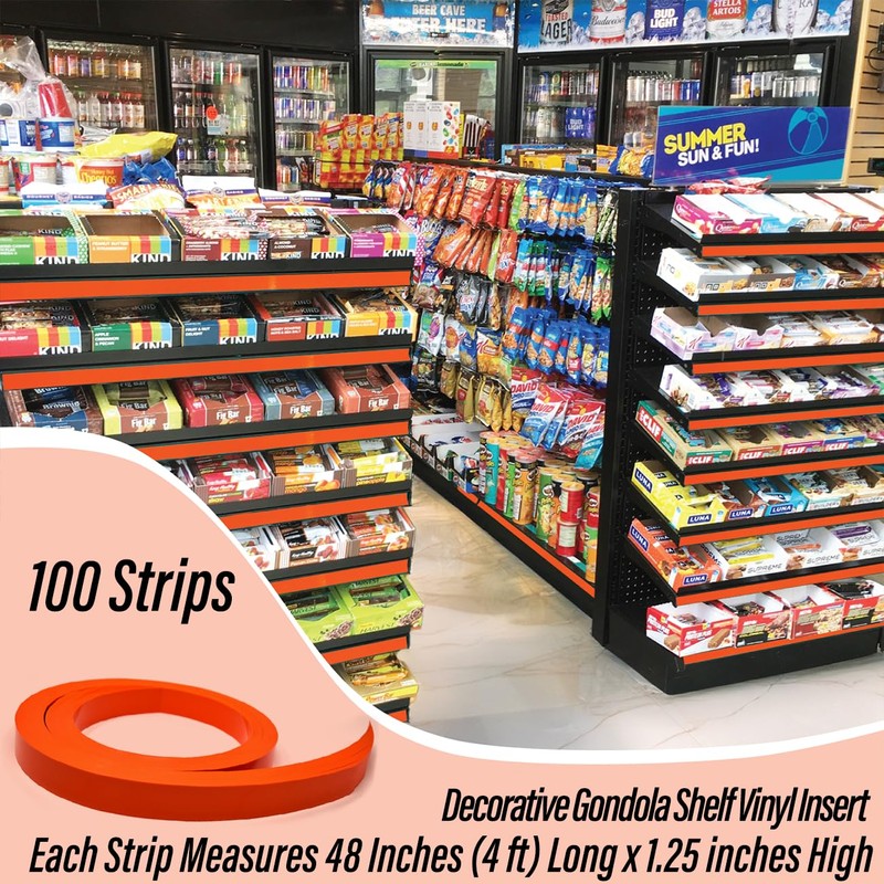 STORE FIXTURES DIRECT Decorative Gondola Shelving Pre Cut Vinyl Insert Strips 48" x 1.25" Shelf C-Channel, Orange, 100 Pack