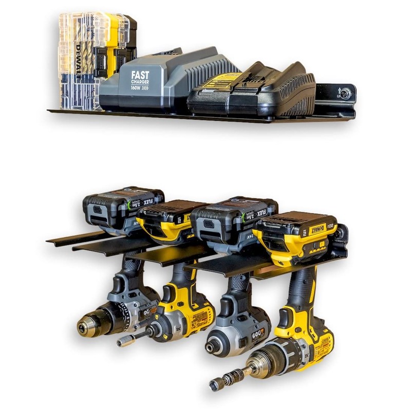 - ORGANIZE YOUR WORKBENCH: Wall-mounted storage for up to 4 drills, plus a shelf for accessories!