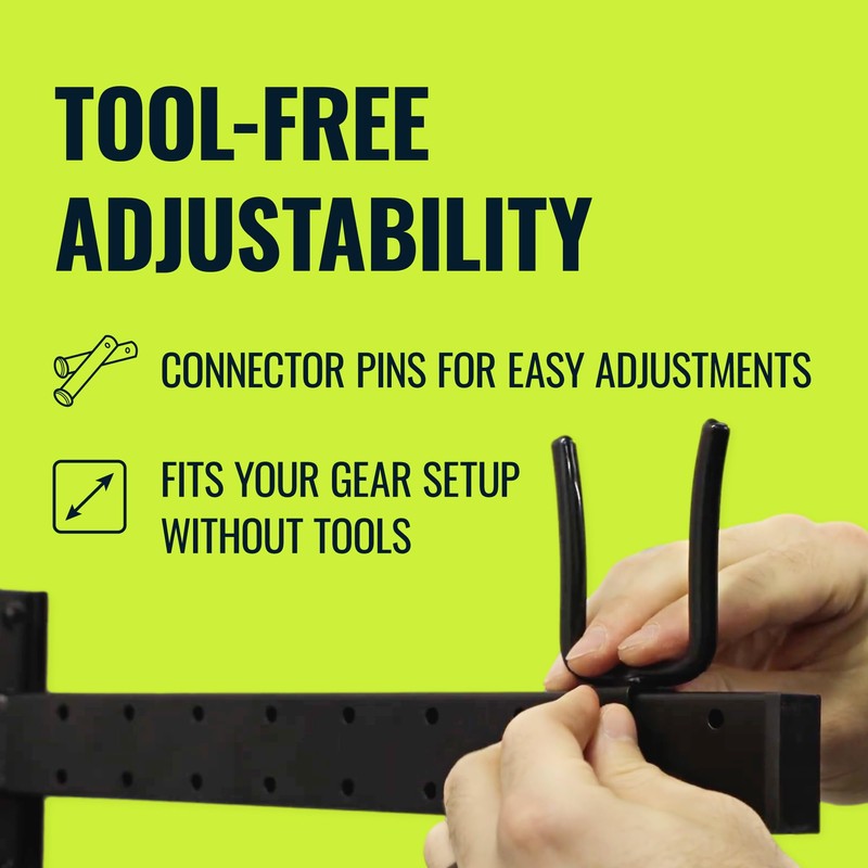 - Protective Hooks: Each storage hook is coated in a durable, protective PVC dip. This coating pads and grips to prevent scratches, and it maintains a secure hold on your gear during storage. Ideal for keeping your gear in top condition.