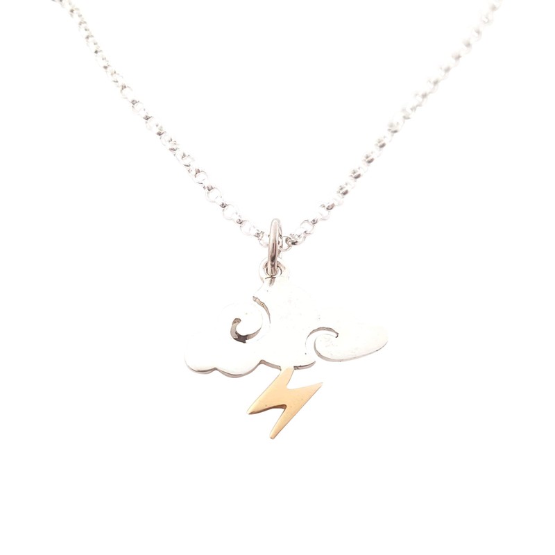 - This dainty necklace is handcrafted featuring a detailed Sterling silver and bronze thunderstorm charm attached to a delicate 18 inch, Sterling Silver cable chain with clasp.
