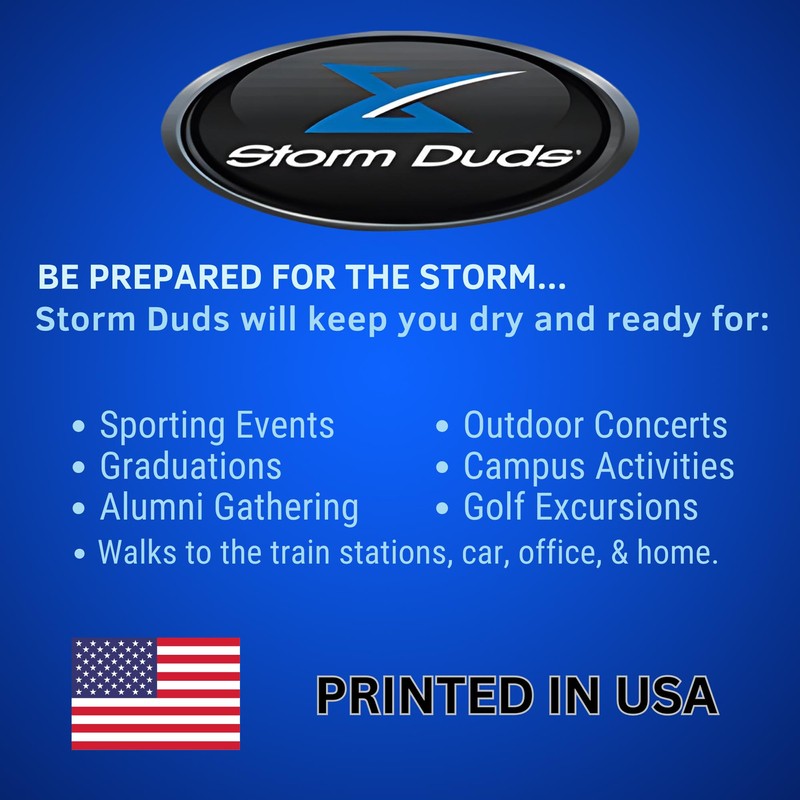 - STORM DUDS HAS YOUR COVERED – Storm Duds has a mission to always keep you prepared and dry, wherever life takes you! Our rain gear includes classic and vented umbrellas, stadium and event spirit ponchos, and bath and beach towels. Stay Dry!