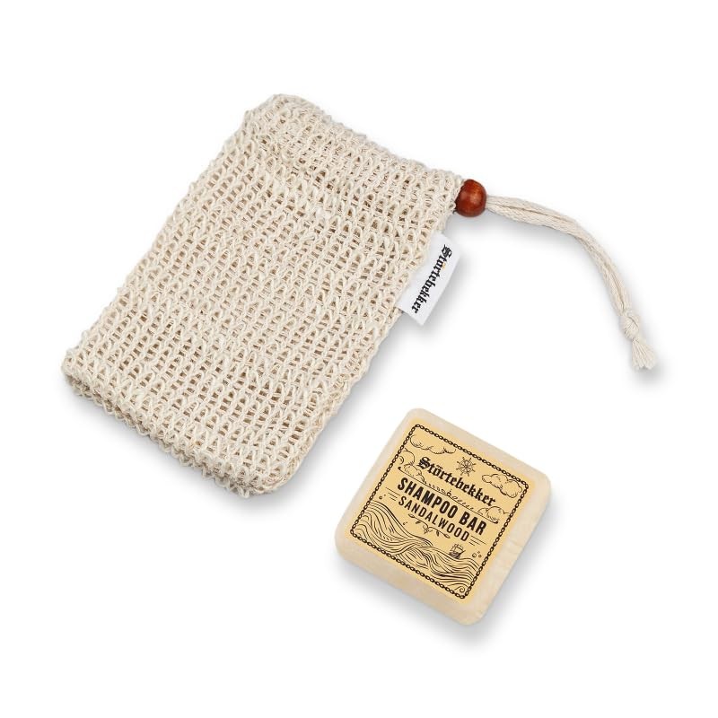 Störtebekker Shower Routine Set - Solid Shampoo x 3 (Sandalwood), Sisal Bag, Soap Box + Free Day Cream - Shampoo Bar Set for Hair, Face & Body - Handmade in Soap Factory