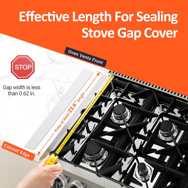 - EASY INSTALLATION: Our universal stove gap cover fits perfectly on all stoves and ovens. Installation is simple - simply peel off the protective film from the stainless steel stovetop gap cover and push it into the gap on the side of the oven. No tools or hardware are required. Please make sure that the length of our stove gap cover (23.6 inches) fits your stovetop gap and does not extend beyond the edge of the cabinet