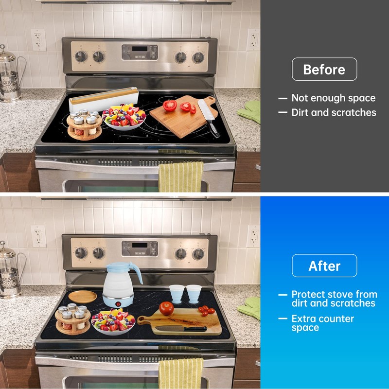 - 【Heat Resistant Up to 400°F】With high heat resistance to withstand temperature up to 400°F /200°C, our glass cooktop cover can be used not only as a heat insulating mattress to protect your kitchen table surface, but also as a temporary ironing mat and washer top cover.