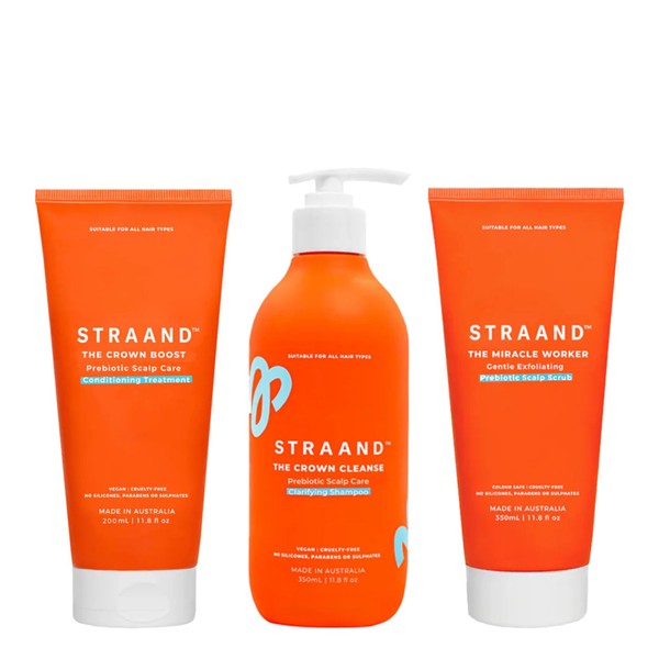The STRAAND Healthy Hair Heroes Bundle is your ultimate solution for vibrant and healthy hair. This comprehensive bundle is designed to rejuvenate and nourish your hair from root to tip. With a carefully curated selection of products, the STRAAND Healthy Hair Heroes Bundle offers everything you need for a complete hair care routine. Whether you're dealing with dryness, dullness, or scalp issues, this bundle has you covered, ensuring your hair looks and feels its best every day. What is included in STRAAND Healthy Hair Heroes Bundle? • Crown Cleanse Shampoo 350ml • Crown Boost Conditioning Treatment 200ml • Miracle Worker Exfoliating Scalp Scrub 350ml What are the features and benefits of STRAAND Healthy Hair Heroes Bundle? Crown Cleanse Shampoo: This gentle yet effective shampoo cleanses your hair without stripping it of its natural oils, leaving it soft, shiny, and manageable. It's perfect for daily use and suitable for all hair types. Crown Boost Conditioning Treatment: Infused with nourishing ingredients, this conditioning treatment deeply hydrates and strengthens your hair, reducing breakage and promoting healthy growth. It leaves your hair feeling silky smooth and full of life. Miracle Worker Exfoliating Scalp Scrub: This exfoliating scrub removes impurities and dead skin cells from your scalp, promoting a healthy environment for hair growth. It soothes and revitalizes your scalp, reducing itchiness and flakiness. Who is STRAAND Healthy Hair Heroes Bundle for? The STRAAND Healthy Hair Heroes Bundle is perfect for anyone looking to improve the health and appearance of their hair, regardless of hair type or concern.